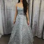 This stunning gold brocade ball gown is crafted from a richly textured metallic fabric featuring an all-over floral jacquard pattern in shimmering gold and silver tones. The strapless sweetheart neckline and fitted corseted bodice create a beautifully structured silhouette that flows into a full, dramatic skirt, finished with a delicate embellished waistband for an extra touch of glamour. Perfect for your debs night, this showstopping gown will ensure you make an unforgettable entrance.
