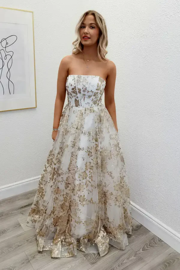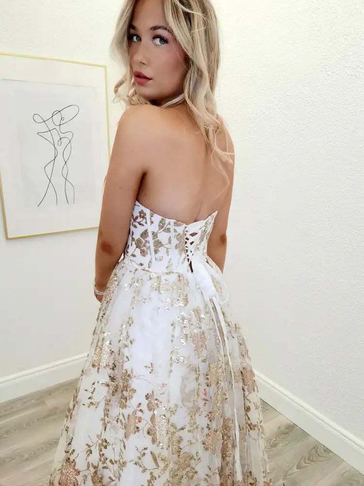 Keelan is a breathtaking white ballgown featuring a structured strapless corset bodice adorned with delicate gold floral embroidery and shimmering sequin detailing that cascades beautifully throughout the full, sweeping skirt. The romantic A-line silhouette is crafted from layers of sheer tulle overlaid with stunning gold glitter lace, creating an ethereal, fairy-tale effect that is guaranteed to turn heads on your debs night. An in-store exclusive available only at Obsession Showroom.
