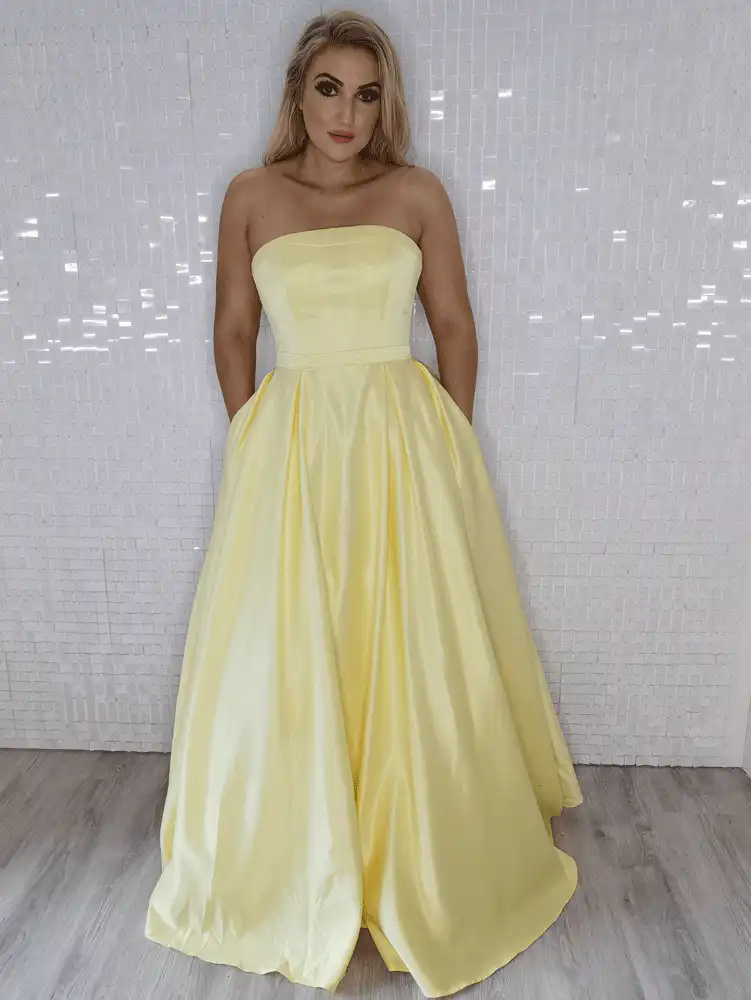 The Kelley Lemon Satin Ballgown is a show-stopping debs style in the most dreamy shade of soft lemon, crafted from luxurious satin that catches the light beautifully as you move. Featuring a sleek strapless neckline and a dramatically full A-line skirt complete with hidden pockets, this gown strikes the perfect balance between classic elegance and modern glamour. Ideal for making an unforgettable entrance on your debs night, this is the dress that will have everyone turning heads. An in-store exclusive available only at Obsession Showroom.