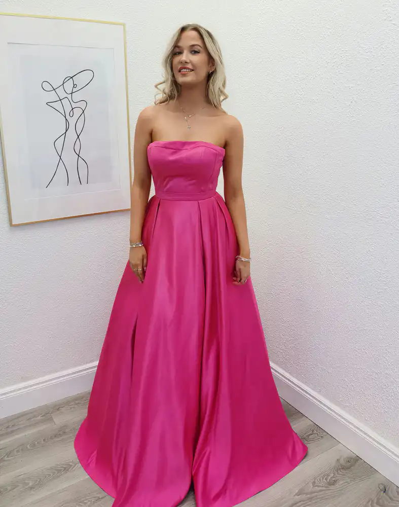 Make a show-stopping entrance in the Kelley Pink Ballgown, a stunning hot pink satin gown that radiates confidence and glamour. Featuring a sleek strapless sweetheart bodice and a full, flowing A-line skirt with a elegant front split, this dress is the perfect choice for your debs night. An in-store exclusive available only at Obsession Showroom.