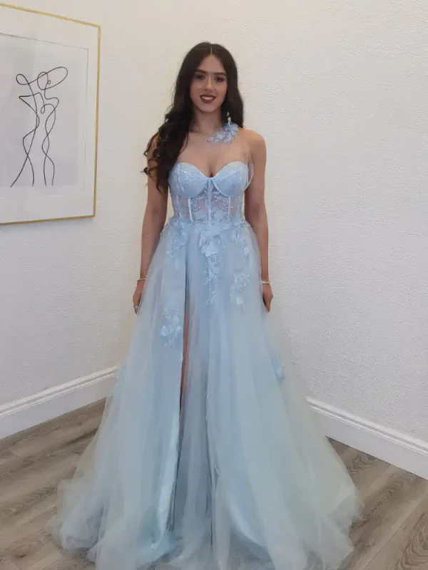 This stunning ice blue ballgown features a dramatic one-shoulder neckline adorned with a delicate floral detail, paired with a structured corset bodice decorated with intricate lace appliqué and floral embellishments that cascade beautifully down the flowing tulle skirt. The dreamy A-line silhouette with a daring front split strikes the perfect balance between elegance and glamour, making it an unforgettable choice for your debs night. An in-store exclusive available only at Obsession Showroom.