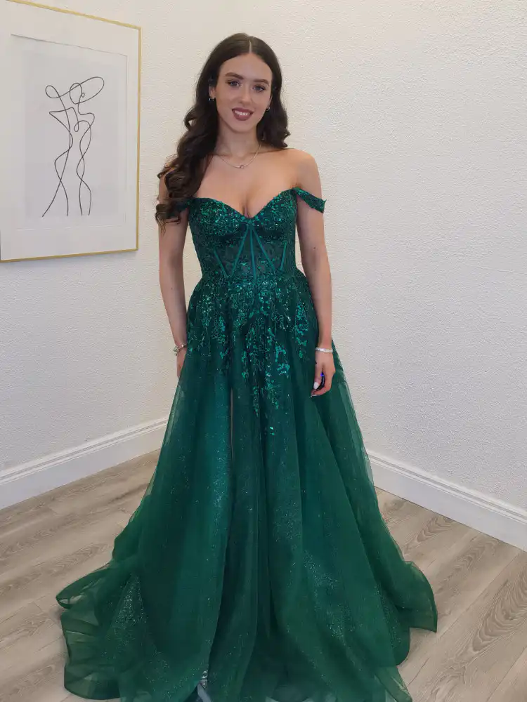 The Kika Off Shoulder Green Ballgown is a showstopping emerald gown featuring a sweetheart neckline with elegant off-the-shoulder straps and a stunning corseted bodice adorned with intricate sequin lace appliqué. The full, flowing A-line skirt in shimmering tulle creates a truly magical silhouette that is guaranteed to turn heads on your debs night. An in-store exclusive available only at Obsession Showroom.