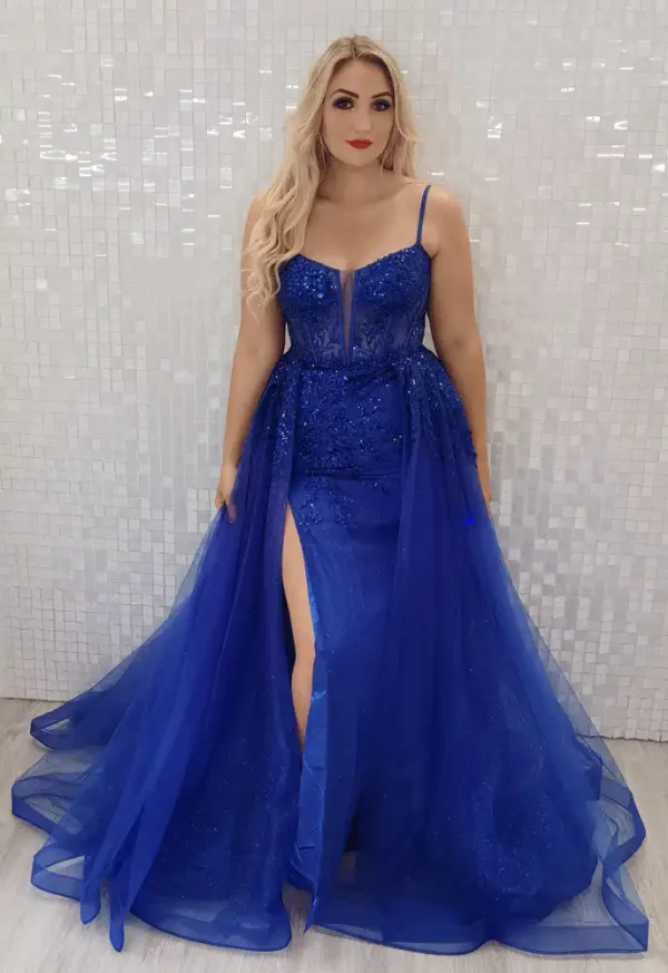 Make a show-stopping entrance in the Kiks Ballgown in Royal Blue, a breathtaking design featuring a fitted sequin and lace appliqué bodice with delicate spaghetti straps and a sweetheart neckline, flowing into a dramatic detachable tulle overskirt that creates an effortlessly glamorous silhouette. The rich royal blue hue is elevated by intricate beaded embellishments throughout, while a daring front split adds a touch of sultry sophistication — perfect for your debs night or any formal occasion where you want to truly stand out. An in-store exclusive available only at Obsession Showroom.