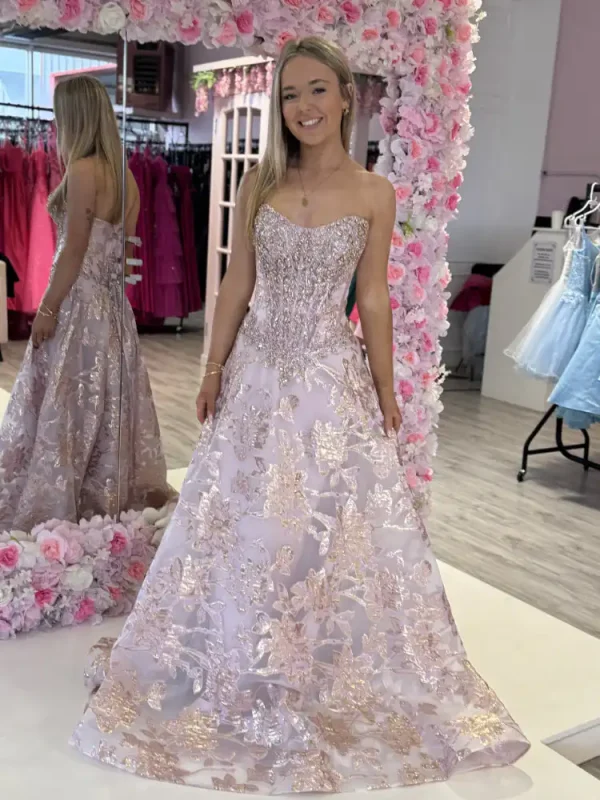 The Kyra Pink Gown is a breathtaking A-line ball gown in soft blush and champagne tones, featuring a sweetheart neckline with a heavily crystal-embellished corset bodice that catches the light beautifully. The full, flowing skirt is crafted from a luxurious floral brocade fabric with shimmering gold detailing throughout, creating an effortlessly romantic and regal finish. Perfect for your debs night, this stunning gown is guaranteed to make you feel like the belle of the ball. An in-store exclusive available only at Obsession Showroom.