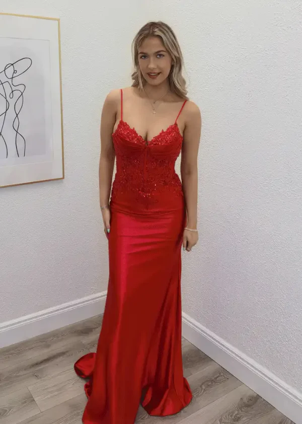 Make a bold entrance in the **Lacinda Red Corset Dress**, a showstopping floor-length gown crafted from luxurious satin with a form-flattering mermaid silhouette and a delicate small train. The fitted corset bodice is adorned with intricate lace appliqué and shimmering sequin detailing, while elegant spaghetti straps and a sweetheart neckline add a touch of timeless romance. Perfect for your debs night, this stunning red gown is guaranteed to turn heads and leave a lasting impression. An in-store exclusive available only at Obsession Showroom.