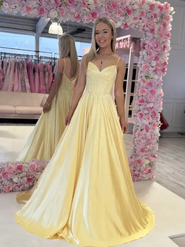 Lara Lemon A-Line Gown is a showstopping debs dress crafted in luxurious soft lemon satin, featuring a romantic sweetheart neckline with delicate spaghetti straps and an elegant, floor-sweeping A-line silhouette. The bodice is adorned with intricate pearl and crystal embellishments that catch the light beautifully, flowing effortlessly into a smooth, full skirt that exudes timeless princess-worthy glamour. Perfect for your debs night, this stunning gown is guaranteed to turn heads and create memories that last a lifetime. An in-store exclusive available only at Obsession Showroom.