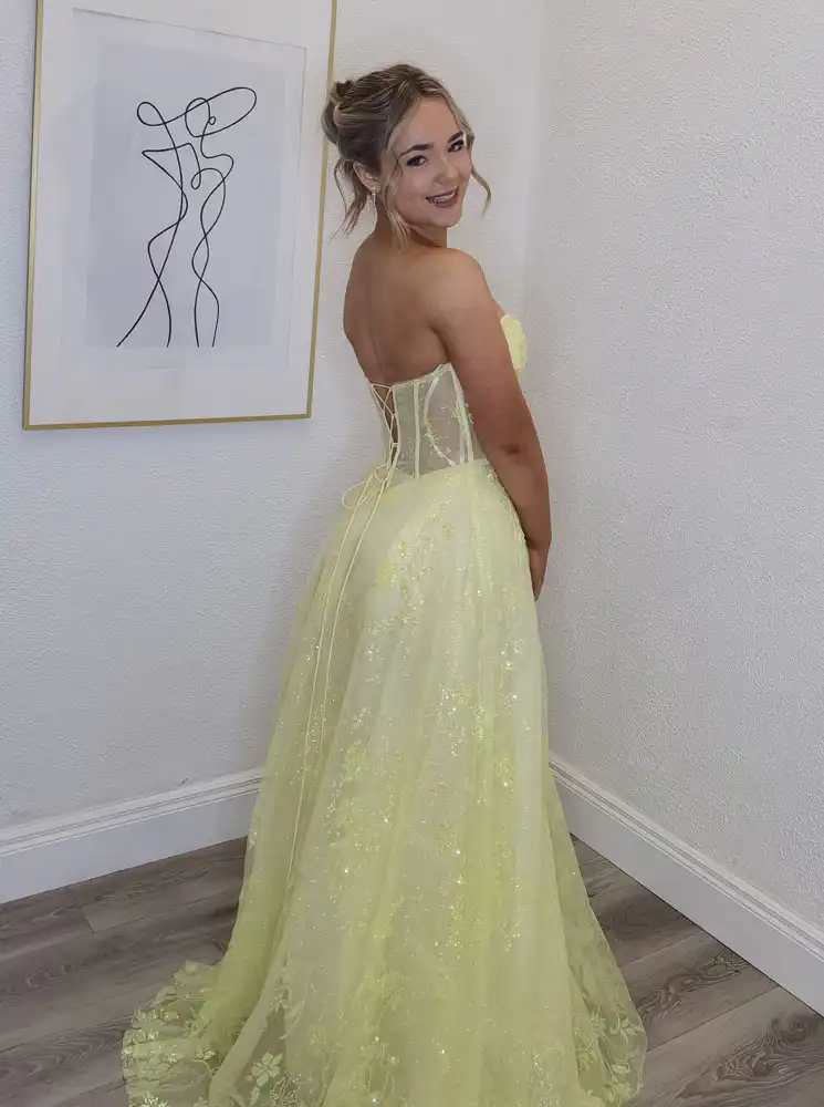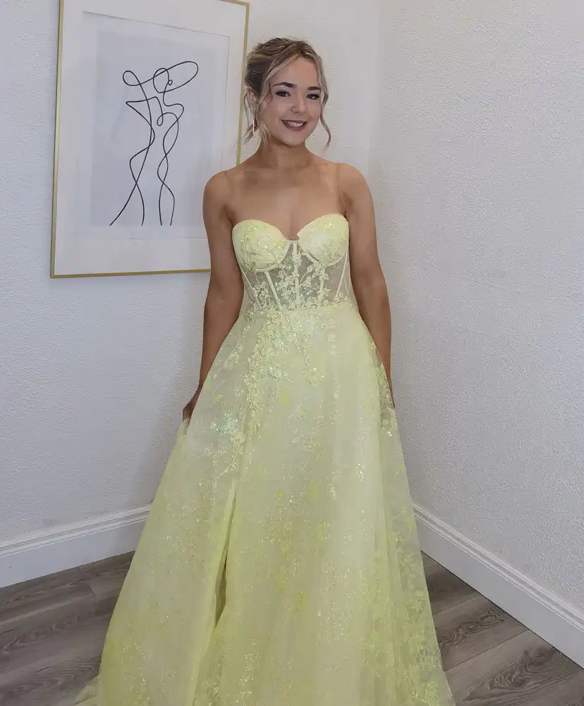 This breathtaking Lemon Ballgown stuns in a fresh lemon yellow with a romantic sweetheart neckline and a voluminous A-line skirt that flows beautifully to the floor. The sheer corset bodice is delicately adorned with intricate floral lace appliqués and iridescent sequins that catch the light with every movement, continuing gracefully across the full skirt for a truly show-stopping finish. Perfect for your debs night, this gown effortlessly blends princess elegance with modern glamour, ensuring you’ll turn heads all evening. An in-store exclusive available only at Obsession Showroom.