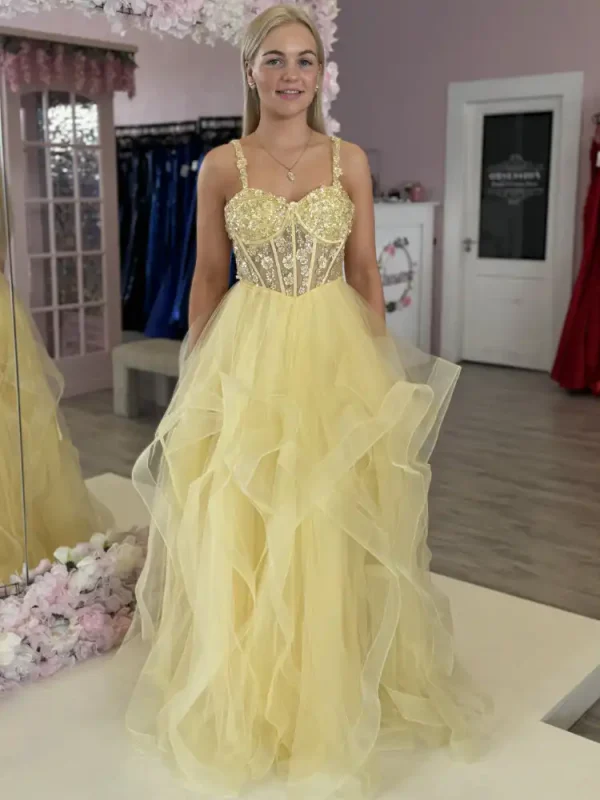 Radiate pure elegance in this stunning lemon tulle ballgown, featuring a sheer boned corset bodice delicately adorned with intricate floral beading and spaghetti straps for a glamorous, feminine touch. The voluminous ruffled tulle skirt cascades to the floor in dreamy, layered tiers, creating a show-stopping silhouette that’s nothing short of fairytale perfection. Perfect for your debs night, this gown is guaranteed to turn heads and leave a lasting impression. An in-store exclusive available only at Obsession Showroom.