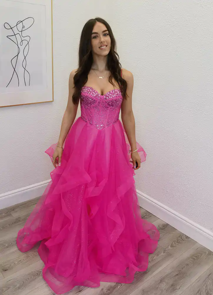 Make a grand entrance in the **Lexis Pink Ballgown**, a show-stopping hot pink creation featuring a heavily embellished crystal and sequin sweetheart corset bodice that cinches beautifully at the waist. The dramatic full skirt cascades into layers of soft, ruffled tulle, creating an ethereal ballgown silhouette that is nothing short of breathtaking. Perfect for your debs night, this gown will ensure all eyes are on you from the moment you walk through the door. An in-store exclusive available only at Obsession Showroom.