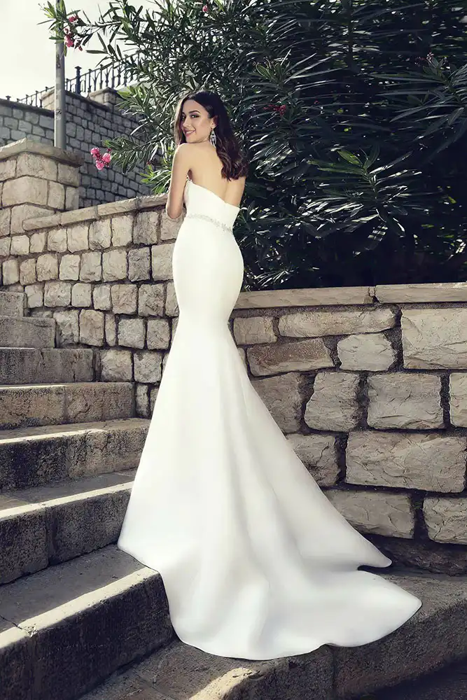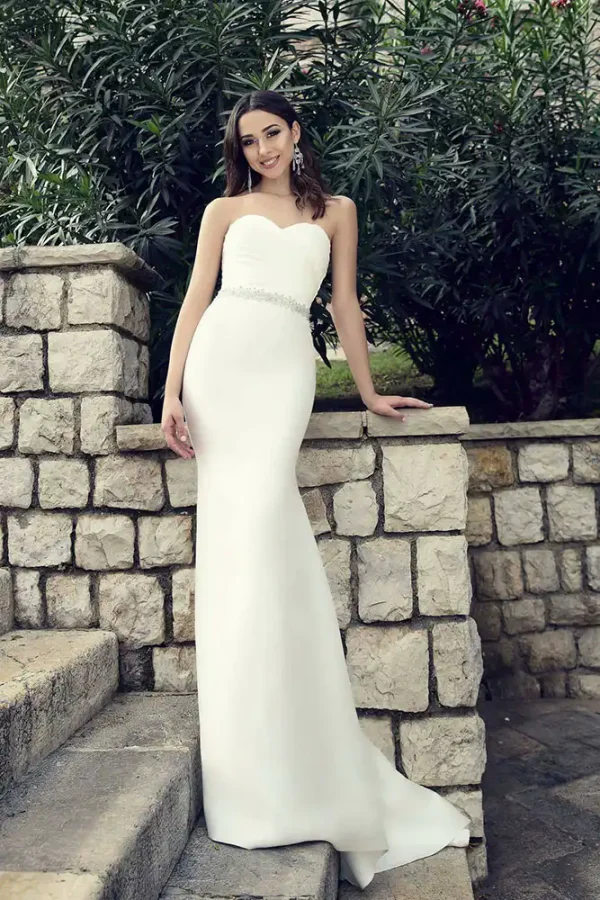 Effortlessly elegant, the Lorena Wedding Gown features a sleek ivory crepe fabric that skims the figure in a stunning fitted silhouette, complete with a romantic sweetheart neckline and a delicate crystal-embellished waist belt that adds just the right touch of sparkle. The clean, minimalist design with a graceful floor-length train makes this gown a timeless choice for the modern bride who lets her natural beauty speak for itself. Available now at a special sale price in our Carlow boutique, the Lorena is the perfect gown for a chic civil ceremony, intimate wedding, or destination celebration.