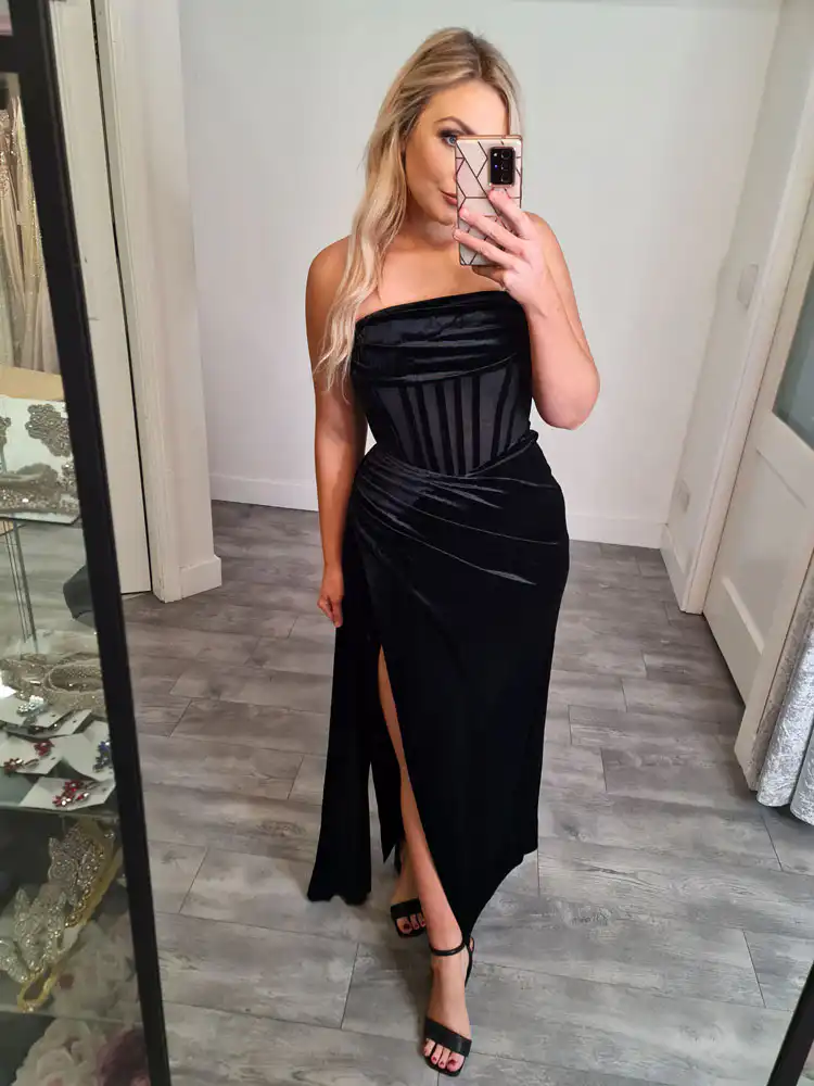 This show-stopping Louise Velvet Corset Dress in classic black is the ultimate debs statement, featuring a sleek strapless neckline and a structured boned corset bodice that hugs your silhouette beautifully. The luxurious velvet fabric flows into a ruched midi skirt with a daring thigh-high split, adding a touch of glamour and confidence to every step. A stunning sale find for any girl wanting to turn heads on her debs night — this one won’t last long!
