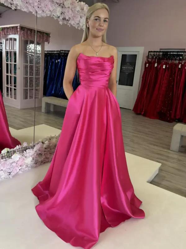 Make a stunning entrance in the **Lulu Hot Pink Satin A-line Gown**, a show-stopping debs dress crafted from lustrous satin in a vibrant hot pink hue that commands attention. Featuring a sleek strapless neckline with elegant ruched bodice detailing and a sweeping full-length skirt with pockets, this gown effortlessly combines glamour with comfort for your most unforgettable night. An in-store exclusive available only at Obsession Showroom.