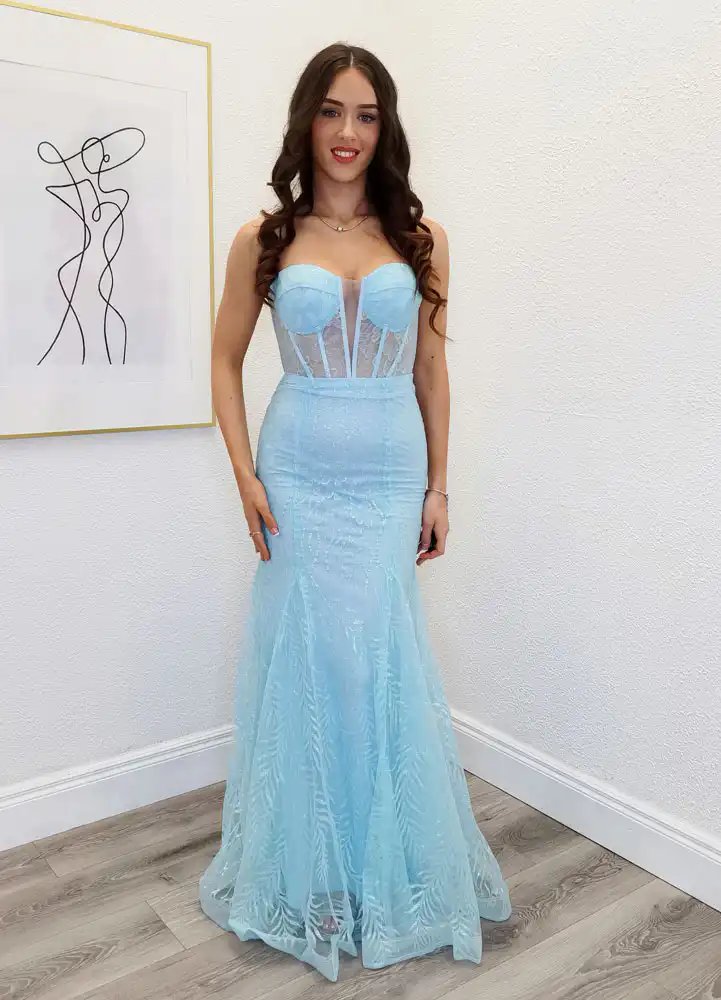 This stunning strapless mermaid gown in dreamy light blue features a structured corset bodice with sheer boning detail and a sweetheart neckline, flowing into a floor-length skirt adorned with delicate glitter leaf embroidery throughout. The fitted silhouette hugs the body beautifully before flaring out at the hem, creating that show-stopping entrance every debs night deserves. A gorgeous choice for your debs or any formal occasion, the Maisie is a true statement piece — and now available at a special sale price.