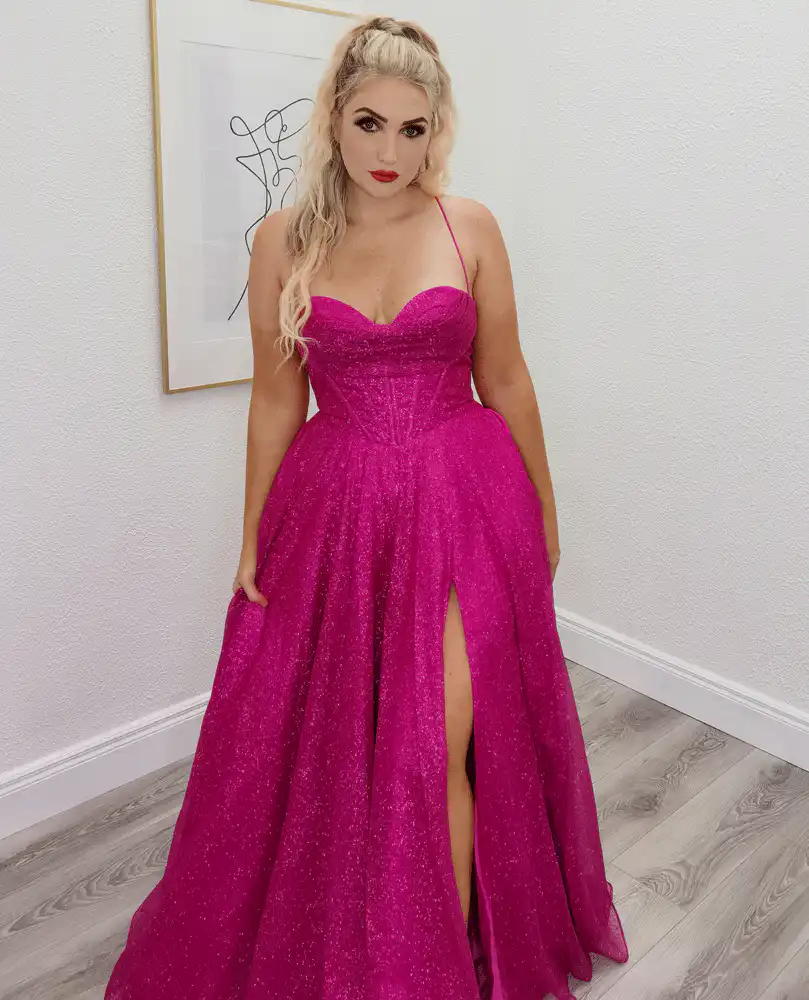 Make a bold entrance in the Mexico Hot Pink Corset Ballgown, a show-stopping fuchsia gown crafted from shimmering glitter tulle that catches the light beautifully with every step. Featuring a sweetheart neckline, delicate spaghetti straps, and a structured boned corset bodice, this stunning ballgown flows into a full, voluminous skirt with a glamorous front split — perfect for the dance floor. Ideal for your debs night, this dress is guaranteed to turn heads and leave a lasting impression. An in-store exclusive available only at Obsession Showroom.