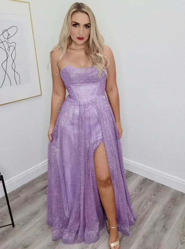 Make a statement this debs season in the Mexico Lilac Sparkle Gown, a breathtaking floor-length A-line dress crafted from shimmering glitter tulle in the most enchanting shade of soft lilac. Delicate spaghetti straps frame a sweetheart neckline, while a structured corset bodice flows effortlessly into a full, flowing skirt with a daring front split — the perfect combination of elegance and glamour. This show-stopping gown is guaranteed to turn heads on your most special night. An in-store exclusive available only at Obsession Showroom.