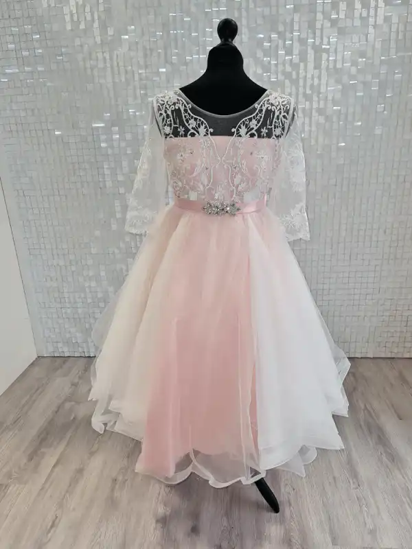 A dreamy blend of elegance and innocence, the Mila features a soft blush pink tulle skirt with a delicate white floral lace bodice and sheer lace sleeves that add a touch of timeless grace. A satin sash waistband with a sparkling crystal brooch centrepiece cinches the waist beautifully, making it the perfect choice for your little one’s special day. Designed for Confirmation, this dress strikes the ideal balance between modest and magical.