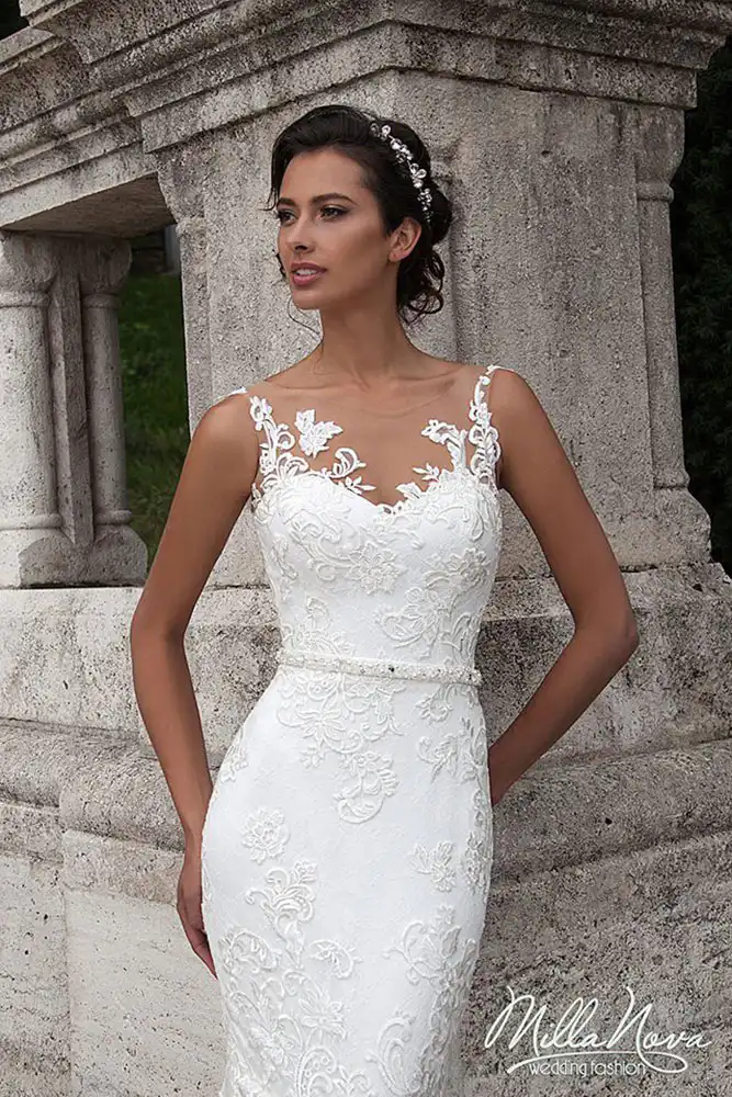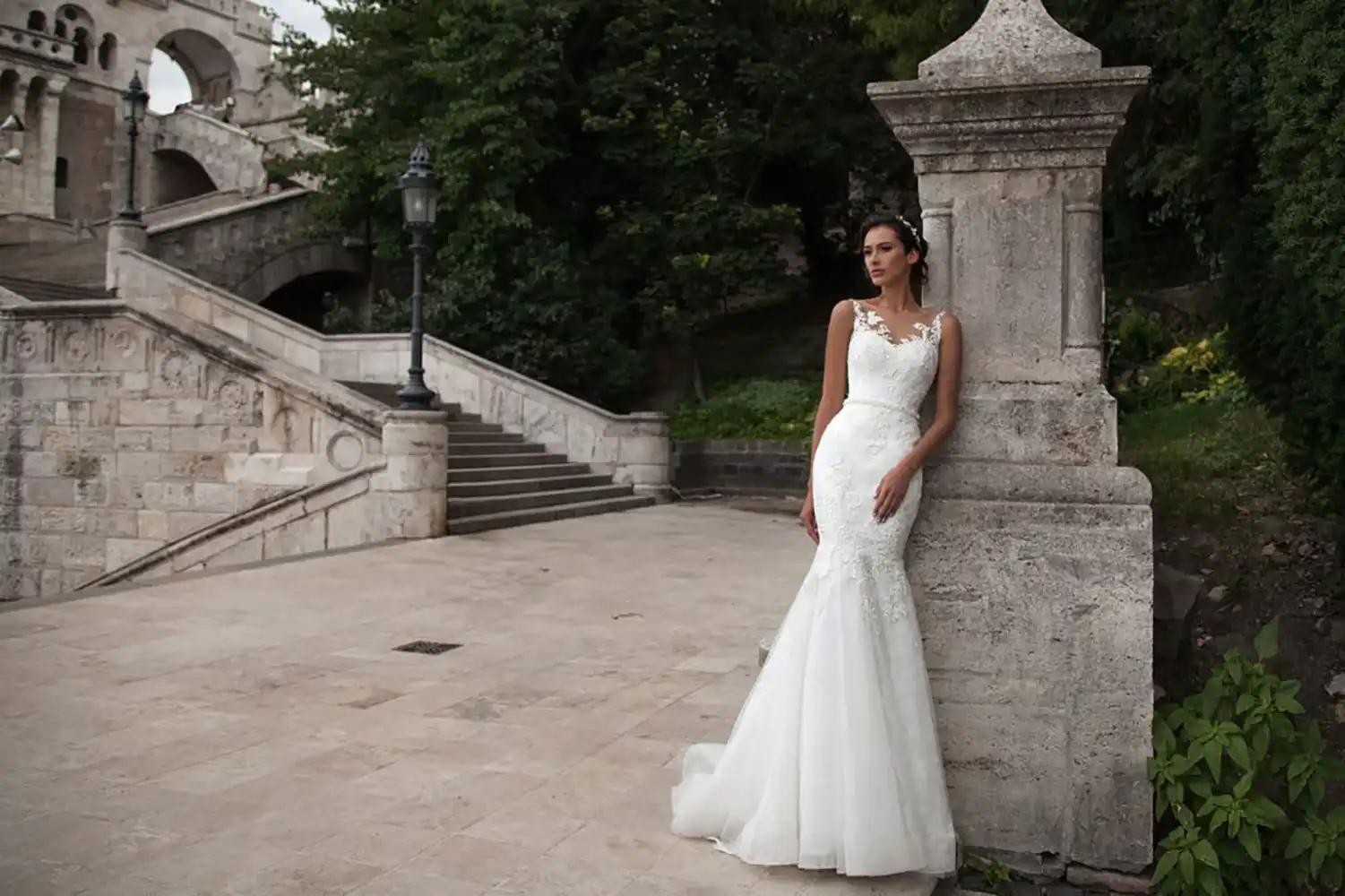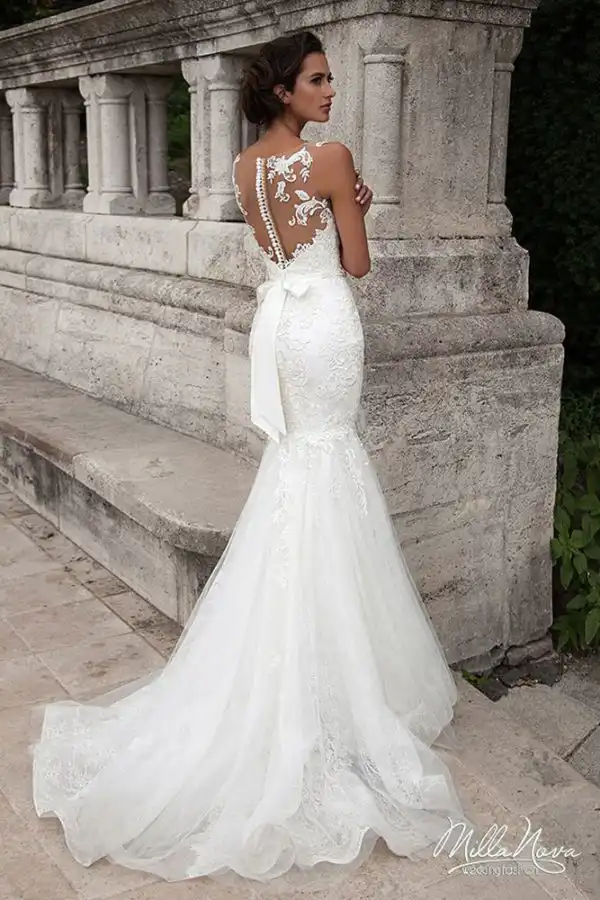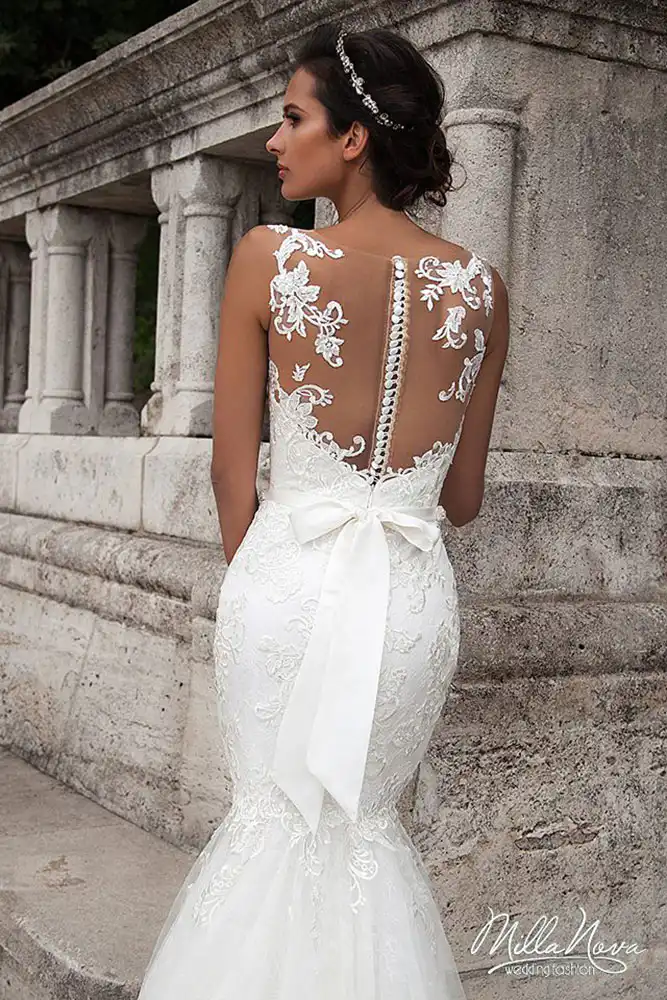 Breathtakingly elegant, the Milla Nova Julia Wedding Gown is a stunning ivory mermaid silhouette crafted from delicate lace and flowing tulle, featuring an illusion back adorned with intricate floral appliqué and a delicate row of pearl buttons. A romantic satin bow at the waist adds a beautifully feminine touch, while the sweeping train makes a truly unforgettable entrance. Perfect for the modern bride seeking timeless sophistication, this gown is available to try at Obsession Showroom in Carlow.