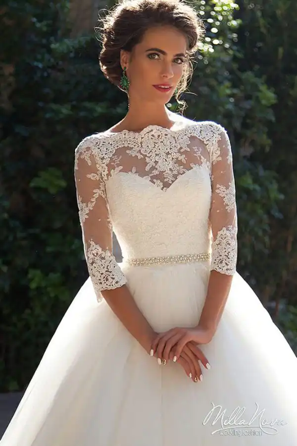 This breathtaking ivory ballgown from Milla Nova features a romantic sweetheart neckline beautifully framed by an illusion lace overlay with three-quarter length sleeves and delicate scalloped edges. The intricate floral lace appliqué bodice is cinched at the waist with a sparkling crystal-embellished belt, flowing effortlessly into a voluminous tulle skirt fit for a fairytale. Perfect for the bride who dreams of a timeless, princess-inspired wedding day look, the Krista is available to try at Obsession Showroom in Carlow.