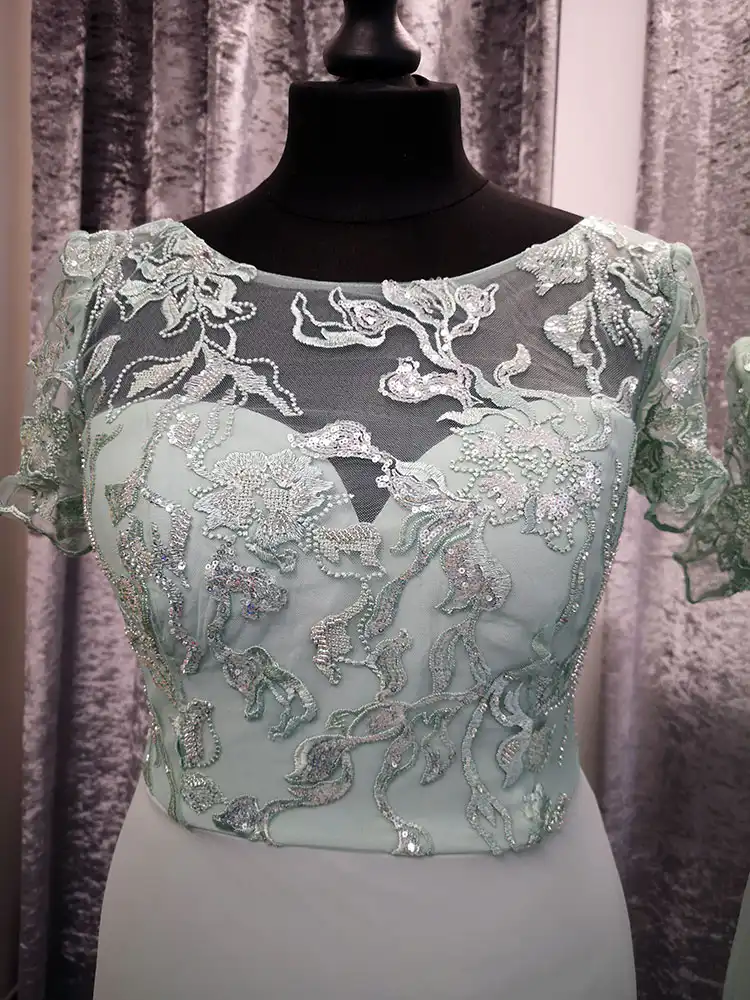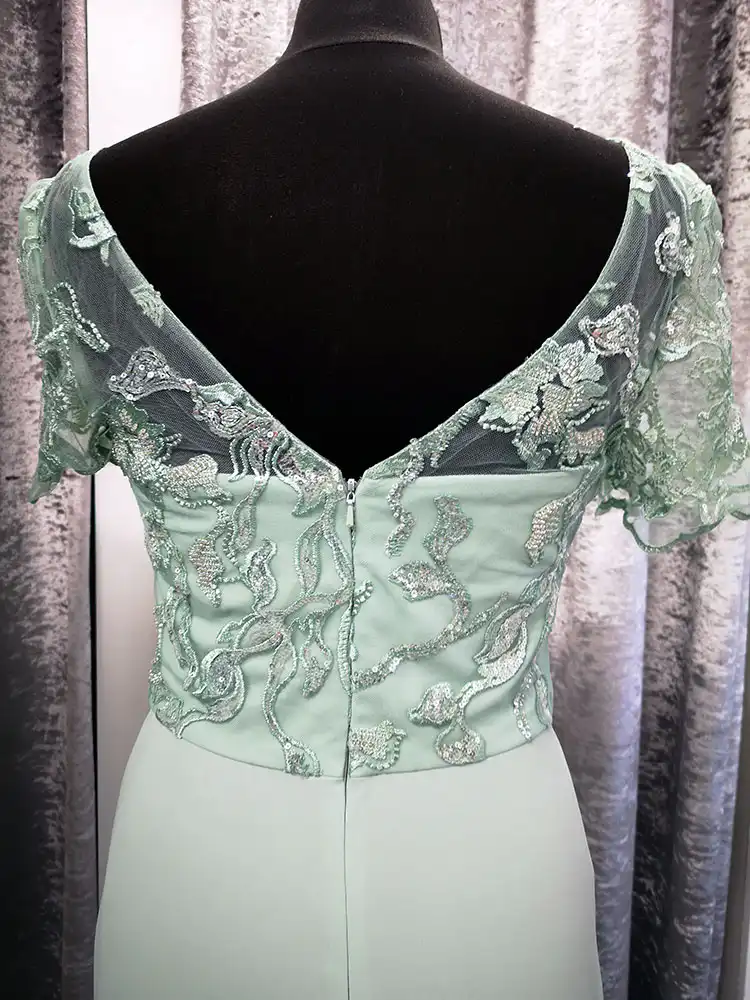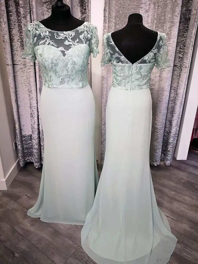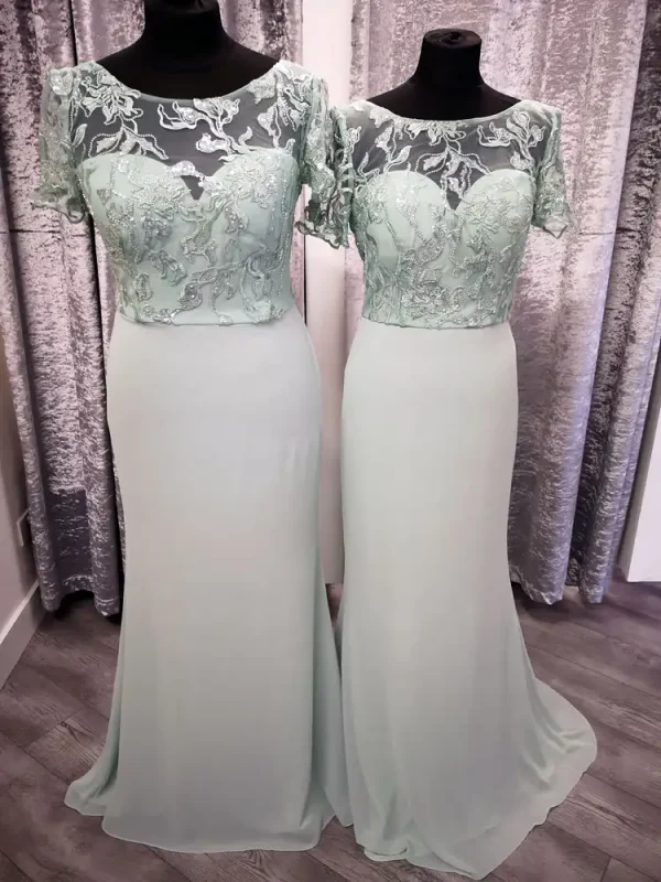 Mindy is a beautifully elegant sage green bridesmaid gown featuring a flattering sheath silhouette with a delicate lace and embroidered bodice adorned with intricate floral appliqué detailing. The illusion scoop neckline and short sleeves add a touch of timeless sophistication, while the V-back creates a graceful, feminine finish. Flowing effortlessly into a smooth chiffon skirt with a subtle train, Mindy is the perfect choice for bridesmaids who want to look polished and refined on your special day.