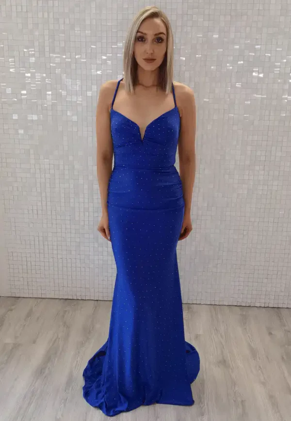 A breathtaking royal blue mermaid gown, the Myla is crafted from a sleek, figure-hugging stretch fabric adorned with delicate scattered diamanté embellishments that catch the light beautifully from every angle. The sweetheart neckline with a plunging centre detail adds an elegant, sophisticated touch, while the crossover spaghetti straps and ruched waist create a stunning silhouette that flows effortlessly into a dramatic floor-length skirt with a graceful train. Perfect for your debs night or any formal occasion where you want to make an unforgettable entrance, this gown radiates confidence and glamour. An in-store exclusive available only at Obsession Showroom.