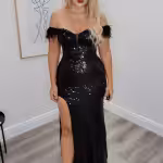 Our stunning paige gown has a gorgeous corset top with cross over back and sequin detailing as well as feathered off the shoulder sleeve