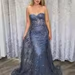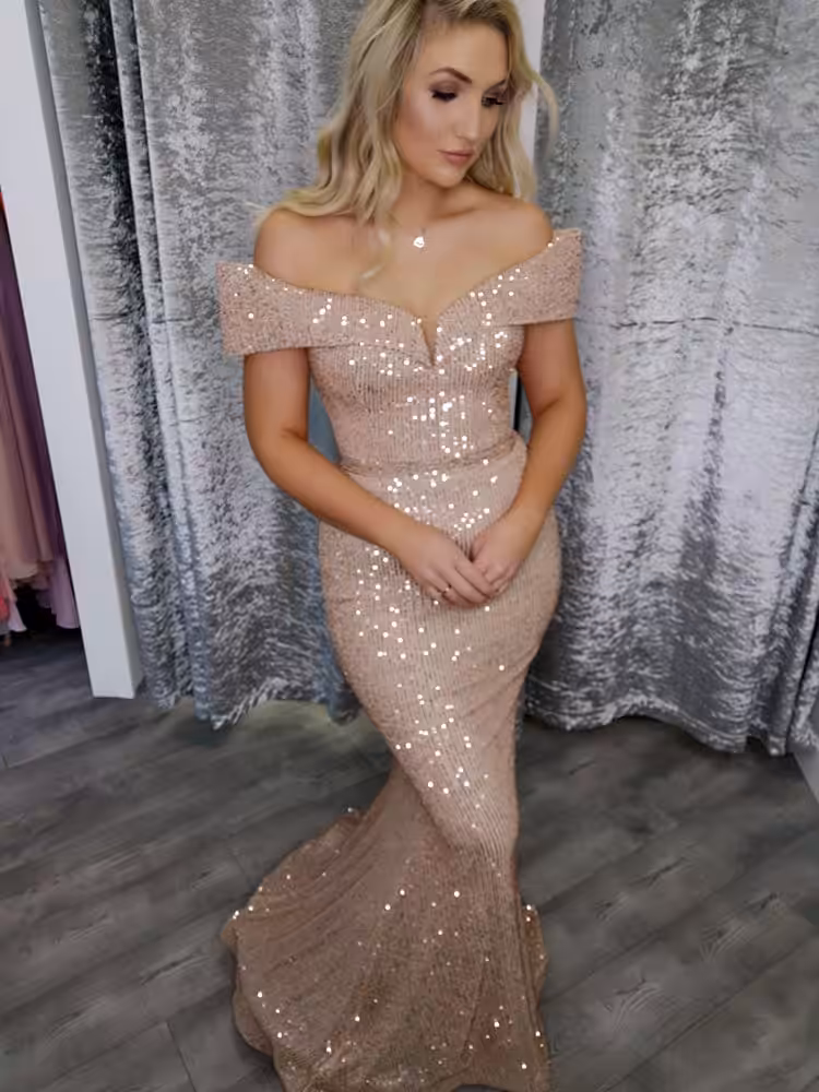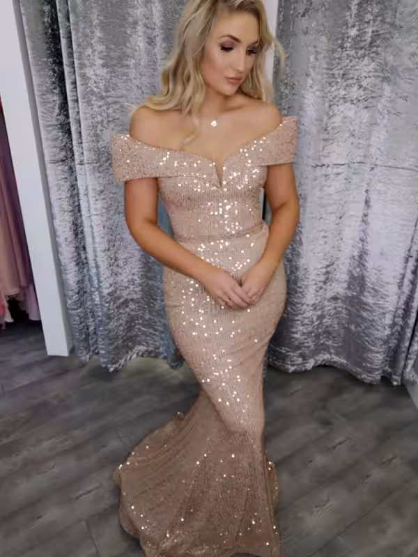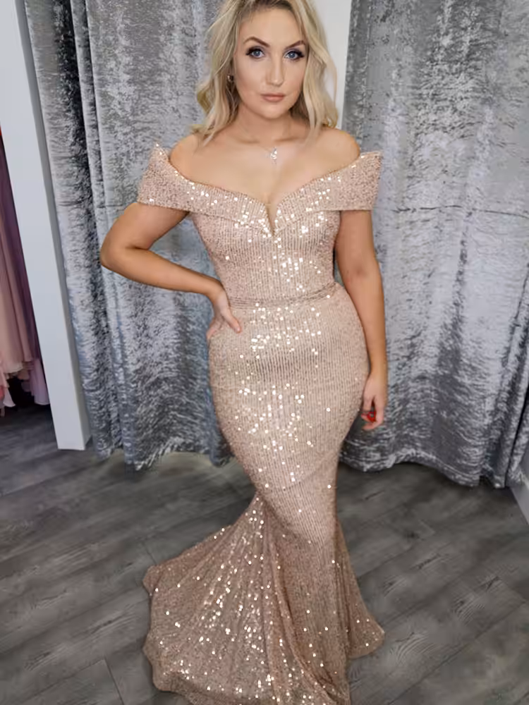 • Beautifully soft sequin Bardot neckline fitted evening dress. Floor length gown.
