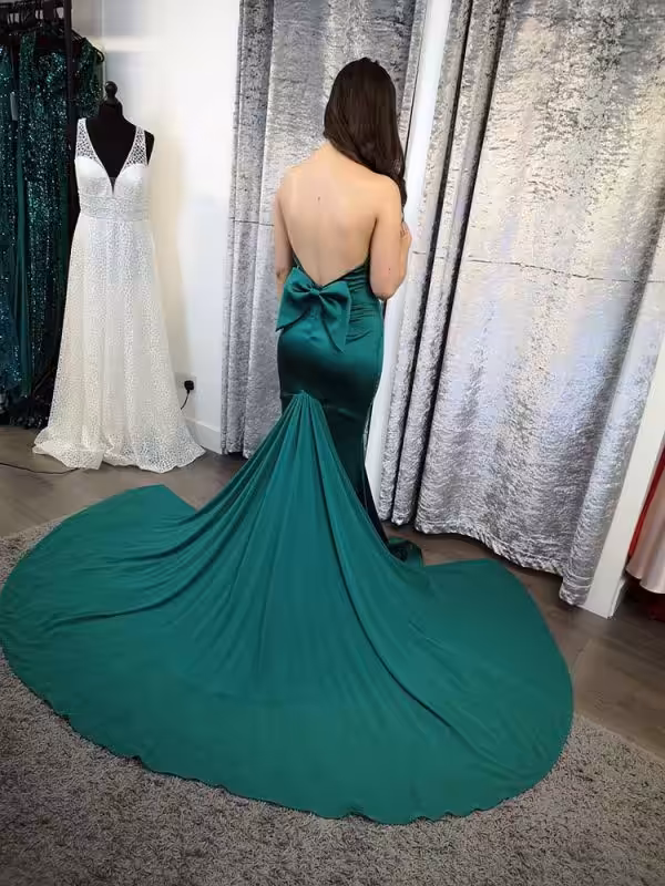 Made from a stretch stain fabric with a low back and detachable straps. It has a beautiful chiffon trail to give the wow factor. Available in sizes 8-14 in royal blue, red, emerald green, and pale blue.