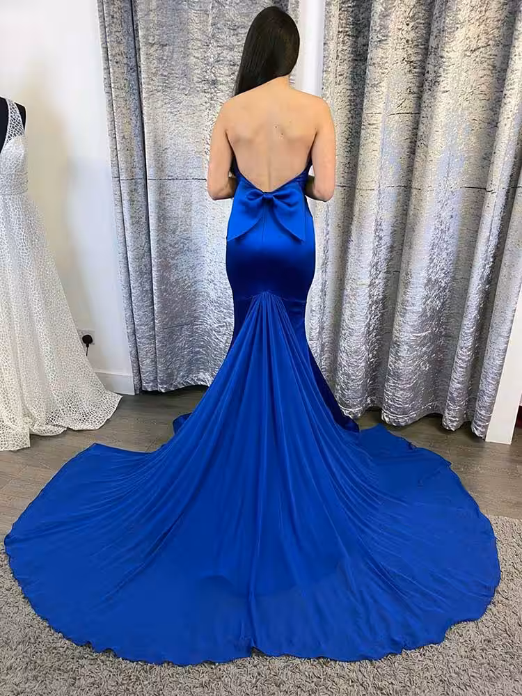 Made from a stretch stain fabric with a low back and detachable straps. It has a beautiful chiffon trail to give the wow factor. Available in sizes 8-14 in royal blue, red, emerald green, and pale blue.