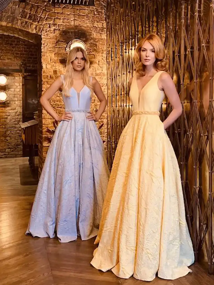 This stunning lemon yellow ballgown, style PIA1999, features a smooth satin bodice with a deep V-neckline and a delicate crystal-embellished waistband that transitions beautifully into a full, floor-length skirt crafted from luxurious textured lace. The A-line silhouette is elegantly voluminous, making it an absolutely showstopping choice for your debs night — channelling serious Belle-of-the-ball energy in the most glamorous way. Currently available at a special sale price, this is a dream dress for any young woman wanting to make a lasting impression. An in-store exclusive available only at Obsession Showroom.