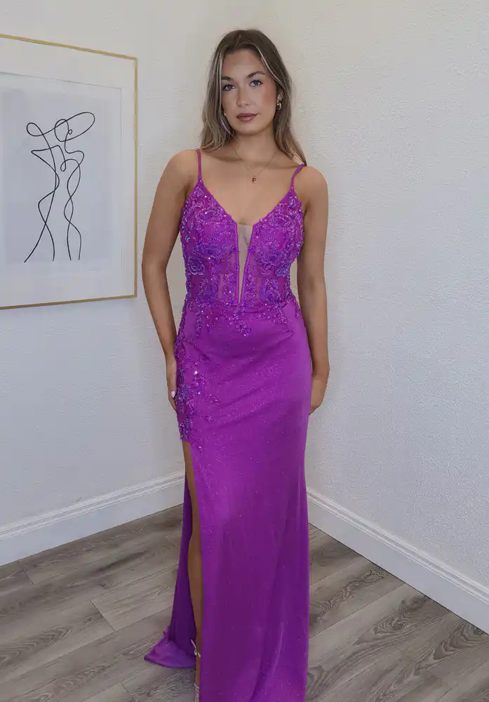 Make a bold entrance in this stunning violet purple evening gown, featuring a figure-hugging silhouette with a deep V-neckline and delicate spaghetti straps. The intricate beaded and embroidered lace bodice adds a touch of luxury, while the sleek, flowing skirt with a daring side slit creates an effortlessly glamorous look perfect for your debs night. An in-store exclusive available only at Obsession Showroom.