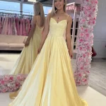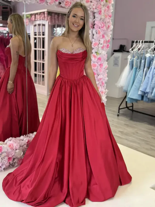 A show-stopping deep crimson ballgown in a luxurious satin finish, featuring a structured sweetheart neckline with a delicate crystal-embellished trim that catches the light beautifully. The fitted bodice flows into a dramatic full skirt with a sweeping train, creating a classic yet breathtaking silhouette perfect for your debs night. This stunning in-store exclusive is guaranteed to turn heads and make a lasting impression on your most special evening.