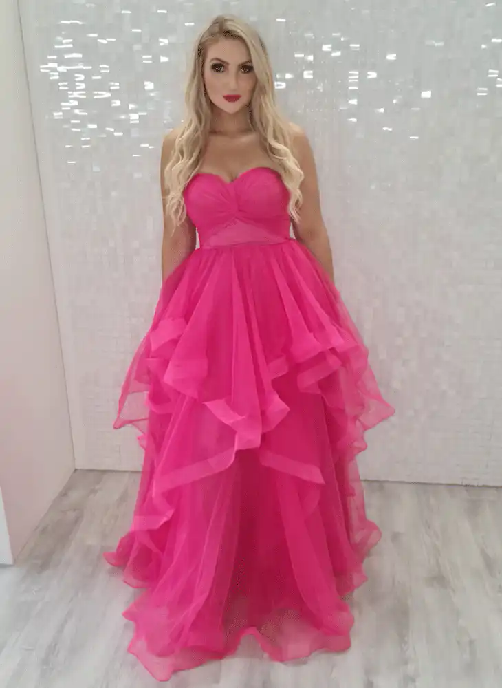 Make a stunning entrance in the Rica Hot Pink Ballgown, a show-stopping fuchsia masterpiece featuring a sweetheart neckline and a dramatic, multi-layered tulle skirt that sweeps the floor in glorious ruffled tiers. The structured strapless bodice with its softly ruched bust creates a beautifully feminine silhouette, while the sheer waistband adds a subtle, elegant detail. Perfect for debs or any formal occasion where you want to truly turn heads — and now available at a special sale price, this is your moment to shine.