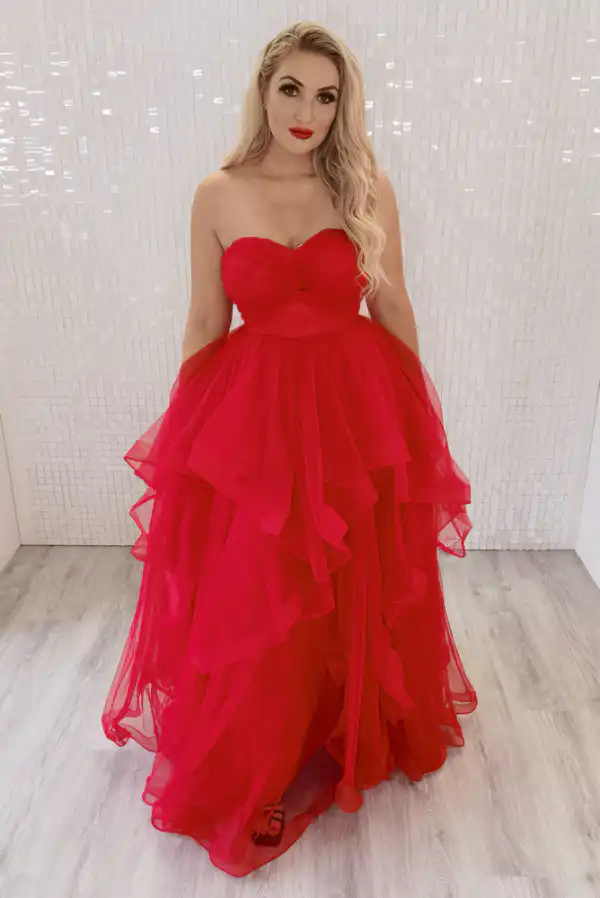 Make a stunning entrance in the Rica Red Ballgown, a show-stopping strapless sweetheart design crafted from sumptuous layered tulle that cascades into a dramatic, voluminous skirt. The ruched bodice adds an elegant structure while the cascading ruffled tiers create effortless movement, making it the ultimate statement piece for your debs night. An in-store exclusive available only at Obsession Showroom.