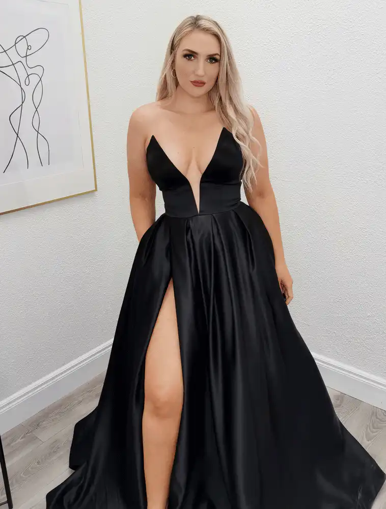 Make a statement on your debs night with the Robyn Black Ballgown, a show-stopping strapless design crafted in luxurious satin with a dramatic A-line silhouette that sweeps beautifully to the floor. The daring deep V-neckline adds an elegant yet bold edge, while the full, voluminous skirt with its striking thigh-high split brings the perfect balance of glamour and sophistication. This timeless black gown is destined to turn heads and create unforgettable memories on your most special night. An in-store exclusive available only at Obsession Showroom.