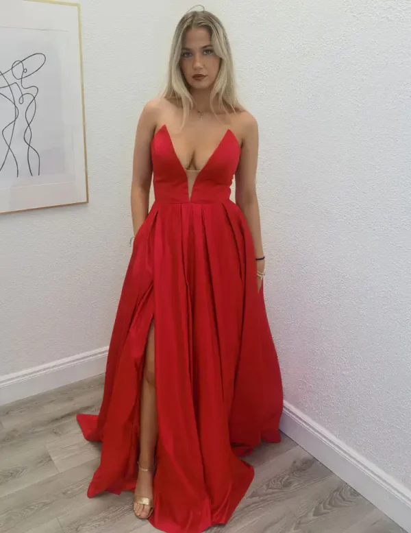 Make a dramatic entrance in the **Robyn Red Ballgown**, a show-stopping scarlet satin gown featuring a daring deep V-neckline, a billowing A-line skirt with a sultry front split, and a sleek, structured bodice that perfectly balances glamour with elegance. The rich, lustrous fabric catches the light beautifully, ensuring all eyes will be on you from the moment you walk in. A flawless choice for your debs night, this breathtaking gown promises to make it a night to remember. An in-store exclusive available only at Obsession Showroom.