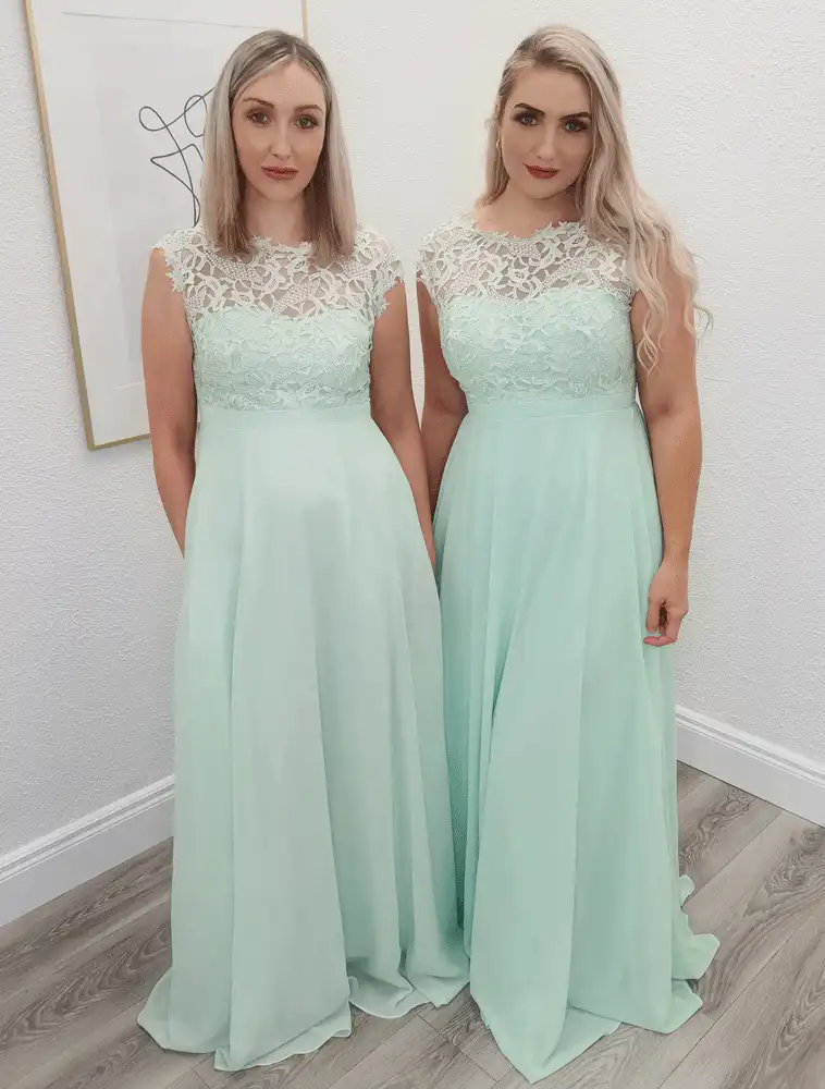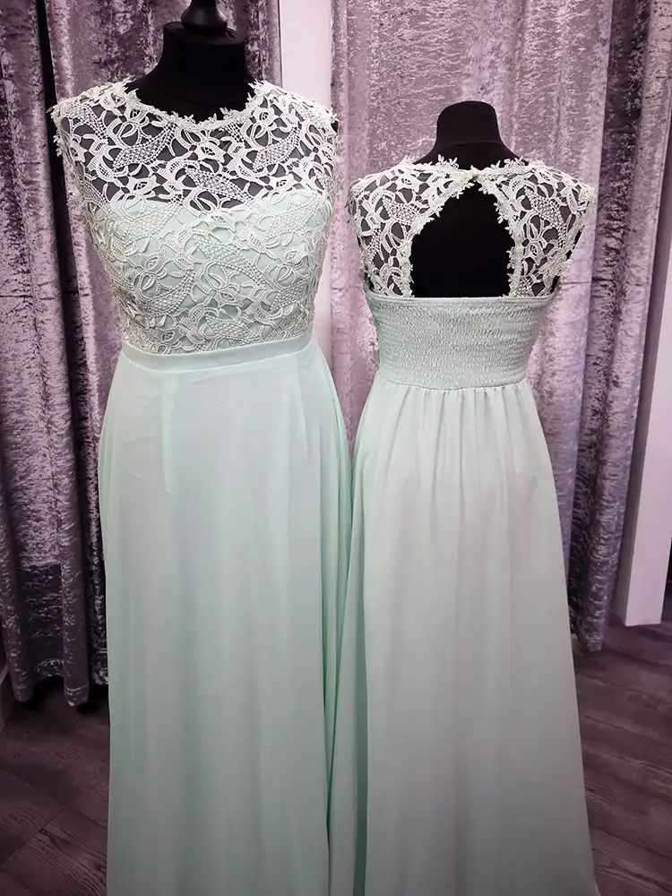 This stunning floor-length bridesmaid dress in the most dreamy mint hue perfectly blends elegance with romance. The delicate ivory lace bodice with a flattering illusion neckline flows seamlessly into a soft, flowing chiffon skirt, creating a timeless A-line silhouette. An ideal choice for bridesmaids who want to look effortlessly chic and coordinated on the big day.