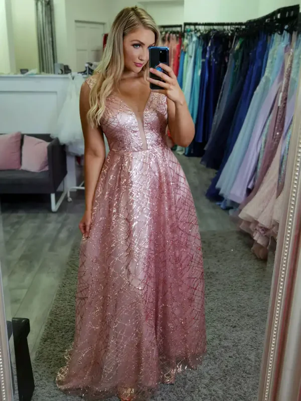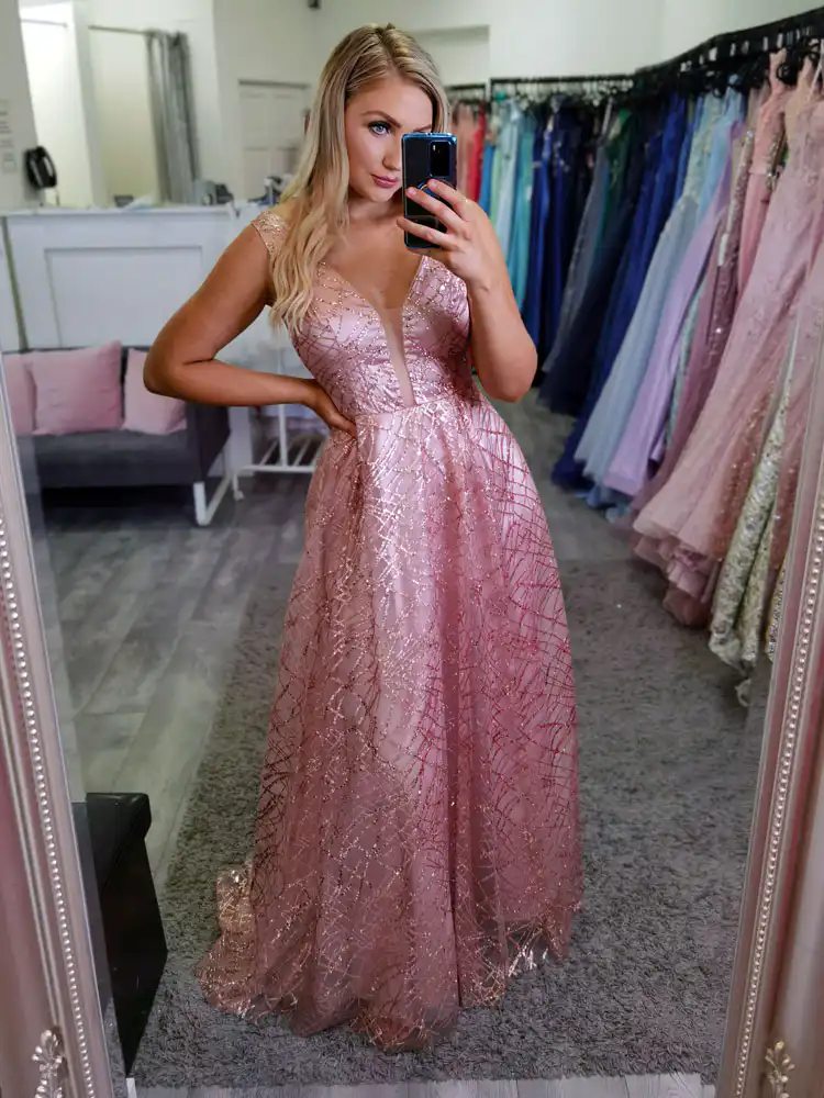 Make a show-stopping entrance in this gorgeous rose gold glitter A-line debs dress, featuring a daring deep V-neckline and a full sweeping skirt that catches the light with every step. The luxurious fabric is adorned with an all-over sequin and glitter geometric pattern, creating a dazzling shimmer effect that transitions beautifully from blush pink to warm gold tones. Perfect for debs or any formal evening occasion, this stunning gown is currently available at a special sale price — so don’t miss your chance to secure this showstopper!