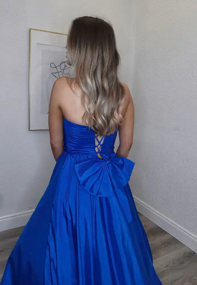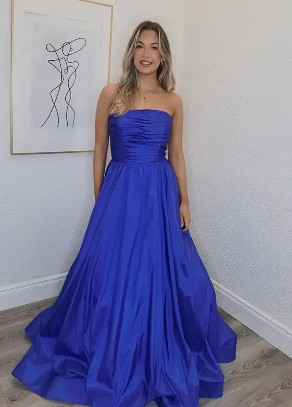 Make a statement on your debs night in this stunning royal blue ballgown, crafted from luxurious satin fabric that catches the light beautifully with every step. The strapless, straight-across neckline features elegant ruching across the fitted bodice, flowing effortlessly into a full, dramatic A-line skirt that sweeps the floor with timeless sophistication. Perfect for your debs or any formal occasion where you want to truly shine. An in-store exclusive available only at Obsession Showroom.