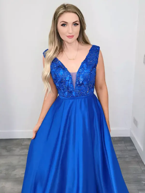 This breathtaking Royal Blue Evening Dress combines a sumptuous satin A-line skirt with a beautifully embellished sequin and beaded bodice for a look that is equal parts glamorous and elegant. The deep V-neckline adds a sophisticated, fashion-forward edge, while the full flowing skirt creates a stunning silhouette perfect for making an unforgettable entrance. An ideal choice for your Debs night, this gown is guaranteed to turn heads and have you feeling like the star of the evening.