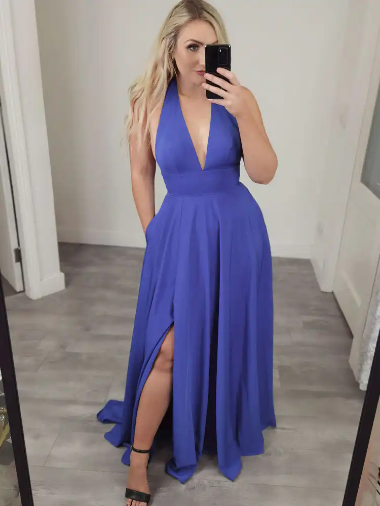 Make a stunning entrance in the **Royal Blue Evening Gown Sd500**, a showstopping floor-length design crafted in a sleek, fluid fabric that drapes beautifully with every step. The deep V halter neckline and fitted waistband create an elegant, elongating silhouette, while the dramatic front split and full A-line skirt add movement and allure — perfect for your Debs night or any formal occasion. An in-store exclusive available only at Obsession Showroom.