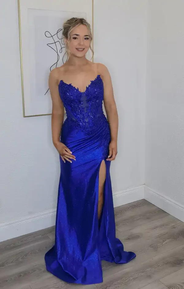 This stunning royal blue fitted evening gown is crafted from a luxurious, shimmering stretch satin that hugs the figure beautifully in a sleek mermaid silhouette. The sweetheart neckline is elevated with intricate lace and beaded floral appliqué at the bodice, adding a touch of glamour and elegance, while a daring thigh-high split brings effortless drama to every step. Perfect for your debs night or any special occasion where you want to truly stand out, this gown is guaranteed to turn heads. An in-store exclusive available only at Obsession Showroom.