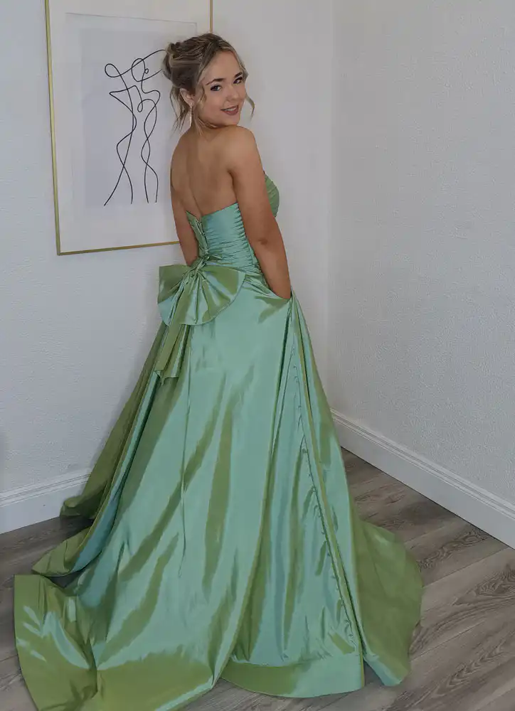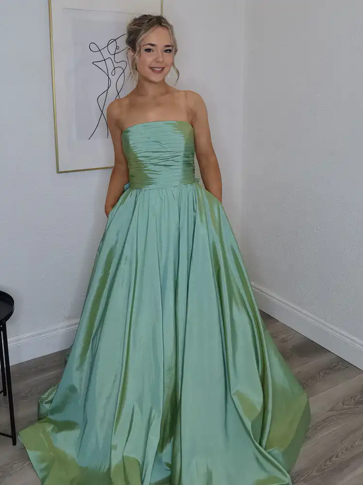 A breathtaking sage green ballgown crafted in lustrous iridescent taffeta, this show-stopping silhouette features a structured strapless neckline with elegant ruched detailing across the fitted bodice, flowing into a dramatically full, sweeping skirt with a beautiful train. The fabric’s subtle two-tone shimmer shifts between mint and deeper green, giving this gown a truly magical, princess-worthy presence that will turn heads from the moment you walk in. Perfect for your debs night, this is the dress dreams are made of. An in-store exclusive available only at Obsession Showroom.