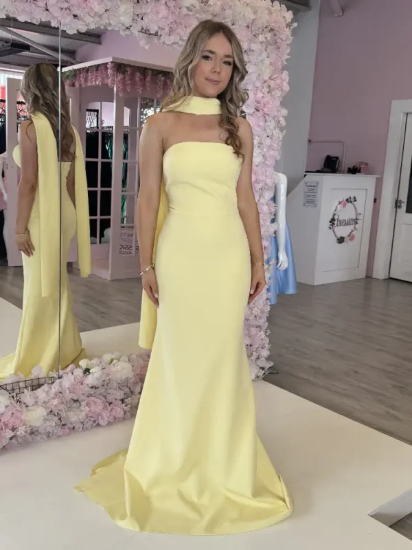 This stunning Sarah Lemon Fitted Gown features a sleek strapless silhouette crafted in a smooth, structured fabric in the most beautiful soft butter-yellow hue, finished with an elegant draped halter-neck detail that adds a sophisticated, fashion-forward touch. The fitted mermaid-style skirt skims the body beautifully before flowing into a graceful train, making it the perfect choice for your debs night or any formal occasion where you want to truly stand out. An in-store exclusive available only at Obsession Showroom.