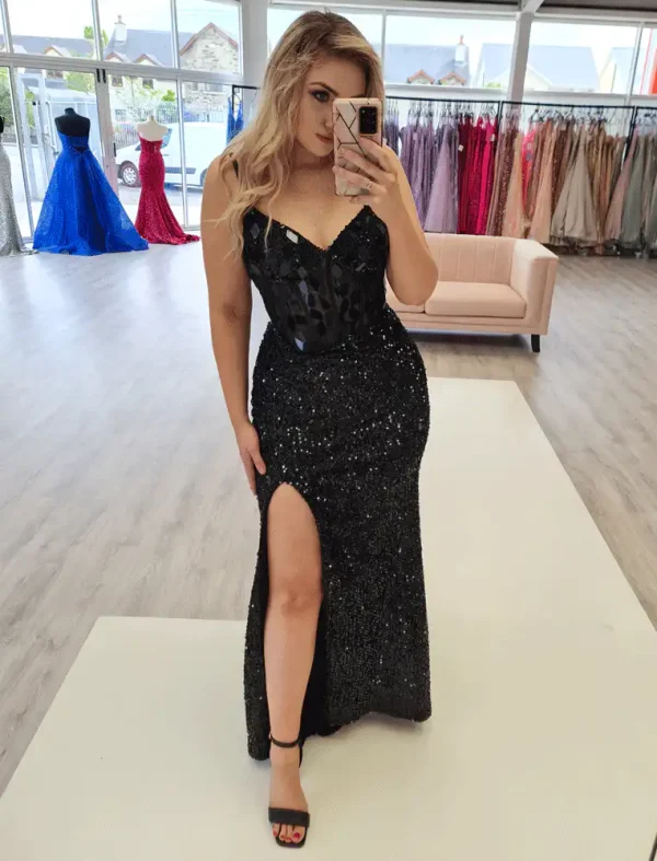 Sasha is a show-stopping black sequin evening gown designed to turn heads from every angle. This sleek mermaid silhouette features a delicate V-neckline with lace trim, adjustable spaghetti straps, and an allover sequin finish that catches the light beautifully, finished with a daring thigh-high side slit for a glamorous, confident look. Perfect for your debs night or any special black-tie occasion, Sasha is the ultimate choice for the girl who wants to make a lasting impression. An in-store exclusive available only at Obsession Showroom.