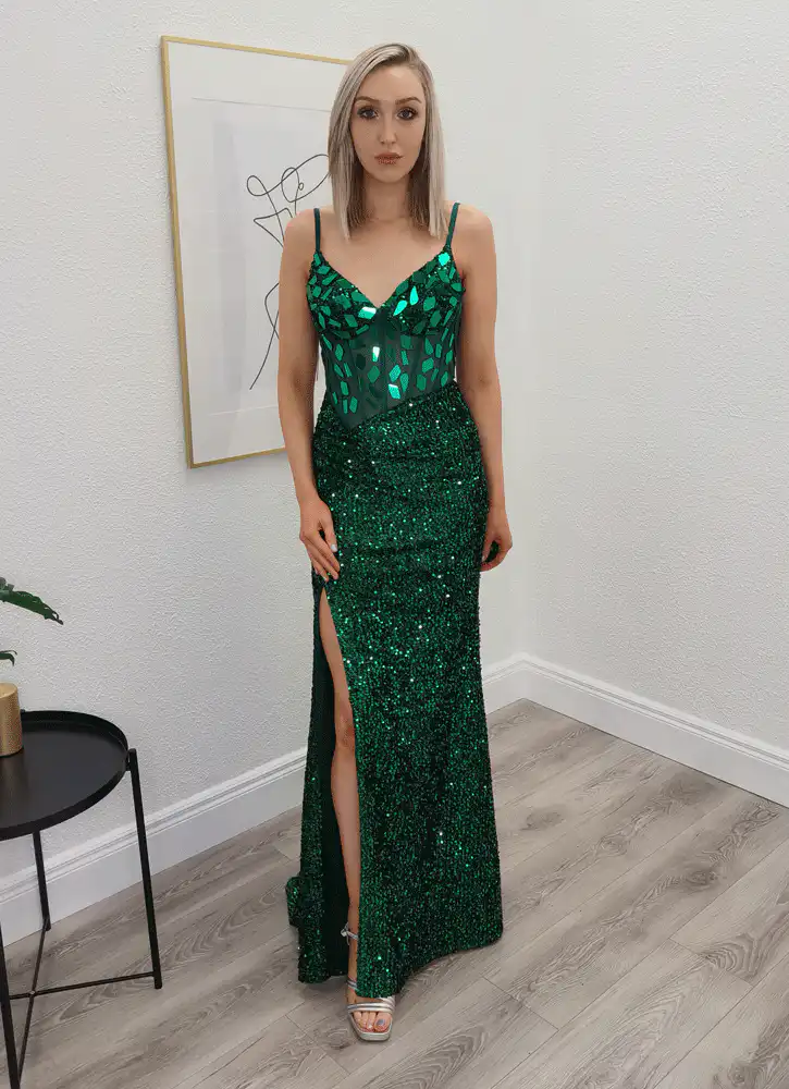 Make a stunning entrance in the Sasha Green Evening Gown, a show-stopping floor-length silhouette crafted in rich emerald green sequins that shimmer and catch the light with every step. The fitted bodice features a sheer corset-style panel adorned with bold mirror-effect gem embellishments, while the spaghetti straps and sweetheart-inspired V-neckline add a touch of elegant glamour. Finished with a daring thigh-high split, this gown is the ultimate choice for your debs night or any formal occasion where you want to truly stand out. An in-store exclusive available only at Obsession Showroom.