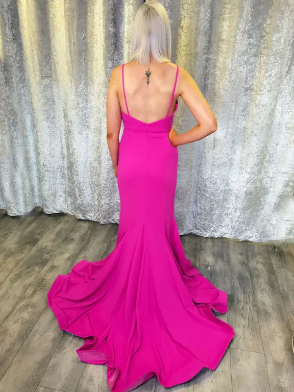 Make a bold entrance in the SD811 Fitted Evening Gown, a stunning hot pink mermaid-style dress that is guaranteed to turn heads at your debs night. Crafted in a smooth, structured crepe fabric, this show-stopping gown features a deep plunge V-neckline with delicate spaghetti straps, a beautifully fitted silhouette that hugs every curve, and a dramatic flared train that sweeps the floor with effortless elegance. Perfect for the girl who wants to make a lasting impression, this vibrant fuchsia gown is the ultimate debs statement piece. An in-store exclusive available only at Obsession Showroom.