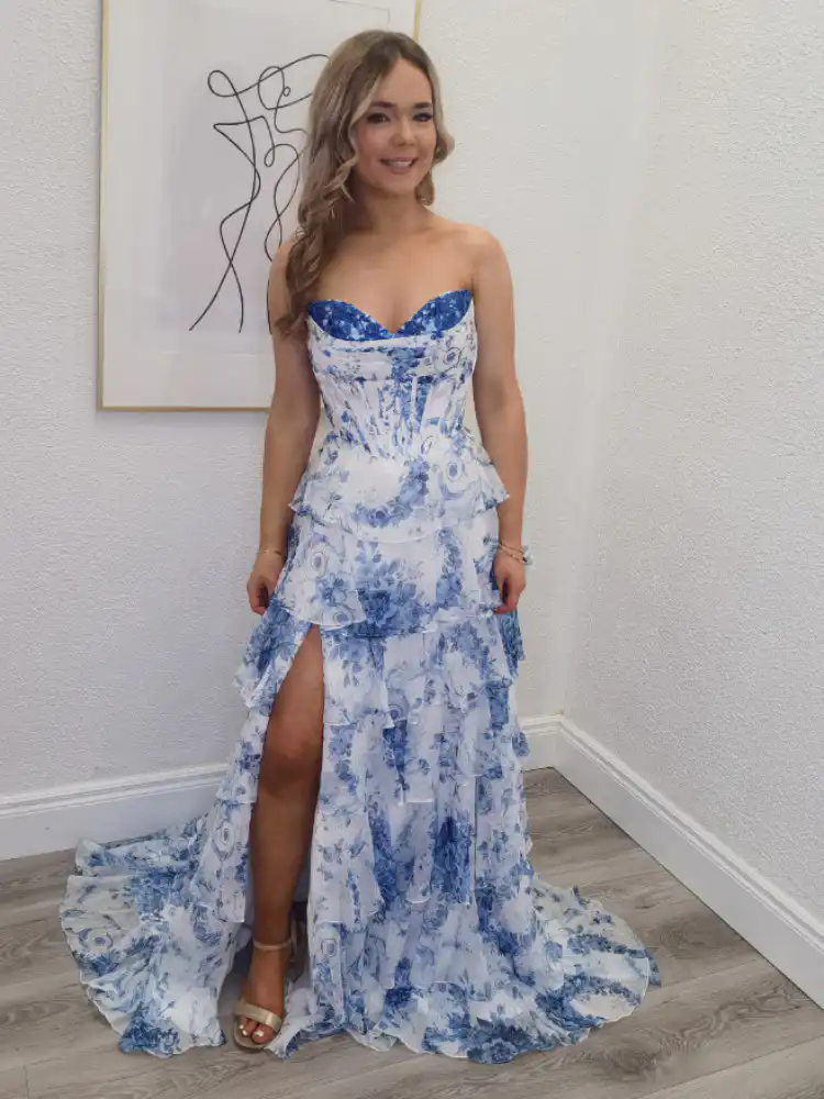 Seraphina is a breathtaking white and blue floral gown featuring a structured strapless sweetheart corset bodice adorned with blue sequin detailing, flowing into a dramatically tiered and ruffled A-line skirt printed with an elegant porcelain-inspired botanical design. The dreamy layered skirt creates effortless movement and a truly show-stopping silhouette, making it the perfect choice for your debs night. An in-store exclusive available only at Obsession Showroom.