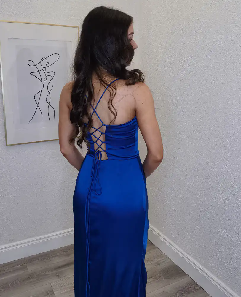 Make a statement in the **Shania Royal Blue Corset Gown**, a stunning floor-length silhouette crafted from luxurious satin fabric that drapes beautifully with elegant ruched detailing at the hip and a daring front split. The structured sweetheart corset bodice with delicate spaghetti straps creates a sleek, figure-flattering look that exudes confidence and glamour — perfect for your debs night. An in-store exclusive available only at Obsession Showroom.