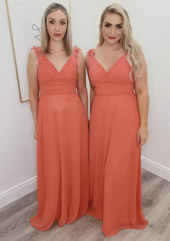 A stunning floor-length bridesmaid dress in a warm burnt orange hue, the Shelly features a romantic V-neckline and a flowing A-line silhouette crafted from soft, lightweight chiffon that drapes beautifully with every step. Delicate floral embellishments adorn the shoulders, adding an elegant touch of texture and femininity to this effortlessly chic style. Perfect for wedding parties, the Shelly is a timeless choice that will have your bridesmaids looking and feeling absolutely radiant.