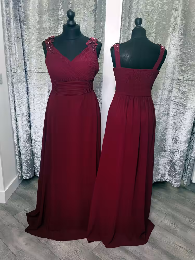 This is a big hit in store, it genuinely suits all sizes. It is made from chiffon fabric with a satin lining. The ruching detail on the bust and waist area are really flattering. The skirt flows past the tummy area and avoids clinging to the tummy. It has beautiful lace and beaded details on the shoulders. The stretch back makes it extremly comfortable to wear.